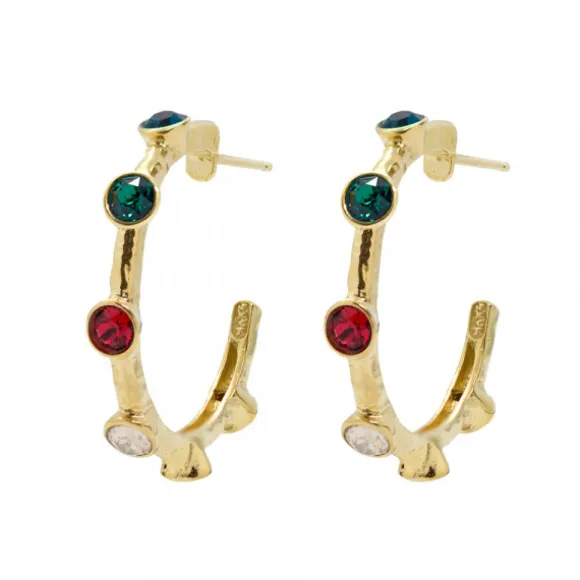 *No se admiten cambios ni devoluciones en artículos de Outlet.Aros de la colección Arrue en Plata de 1ª Ley (925mm) bañados en oro de 18kt. con 6 circonitas de colores alrededor del frontal del aro. Cierre de presión. Diámetro del aro: 33mm. Diámetro de la circonita: 5mm.