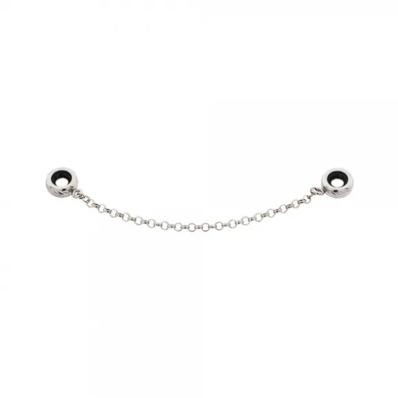 Cadena de Seguridad Diamantada de Plata de 1º Ley (925 mm) para utilizar entre los dos extremos de las pulseras de plata de Eguzkicharm. Contiene una goma negra central en la parte interna del charm. Compatible con pulseras de plata de Eguzkicharm y otras marcas.· Medida de la cadena: 6cm.