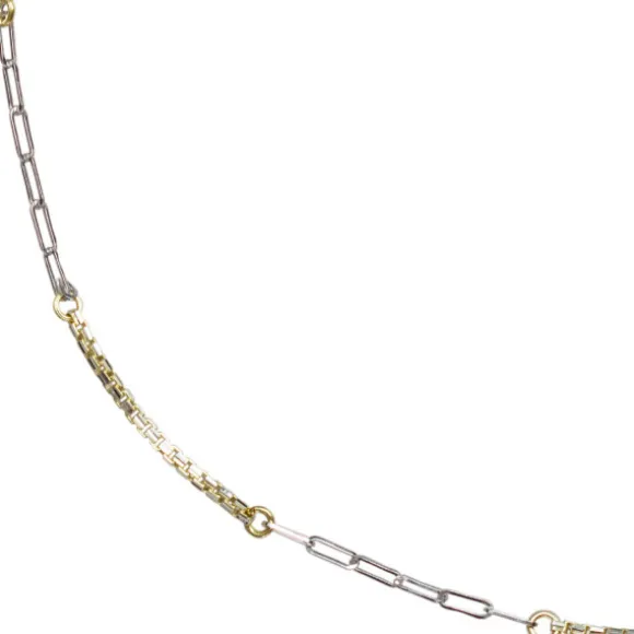 Cadena de Plata de 1ª Ley (925mm) bicolor alternada con eslabones alargados plata y grecas de plata bañada en oro 18kt.. Medidas disponibles: 40cm, 45cm y 50cm. Seleccionar medida en el desplegable.