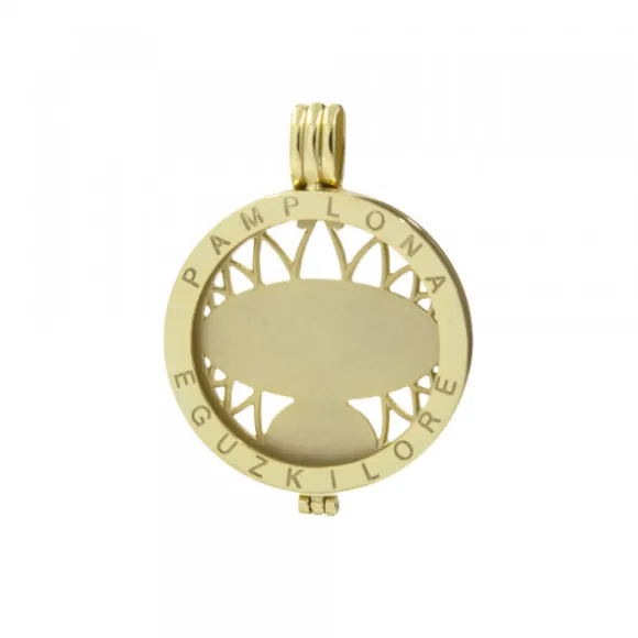 *No se admiten cambios ni devoluciones en artículos de Outlet.Cerco para monedas de Plata de 1ª Ley (925mm) con baño de oro de 18kt. Talla L con grabación en la parte superior con la palabra Pamplona. Diámetro del cerco: 36mm. Diámetro de la reasa: alto 10mm y ancho 8mm