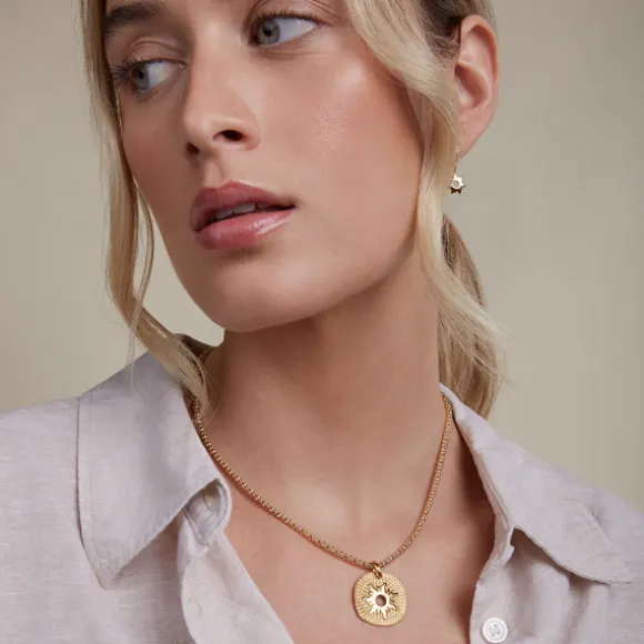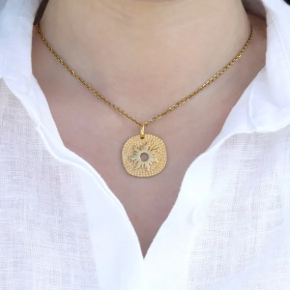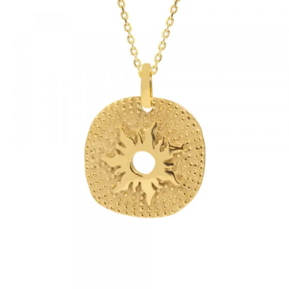 Colgante chapa de Plata de 1ª Ley (925mm) bañado en Oro amarillo 18kt. estilo rústico con motivo Eguzkilore en el centro. Diámetro chapa: 24mm. Medida reasa: alto 9mm y ancho 6mm. Diámetro Eguzkilore: 15mm. Con posibilidad de personalizar por la parte trasera un nombre o fecha. Cadena no incluida.*Una vez realizada la grabación, no se admite devolución.