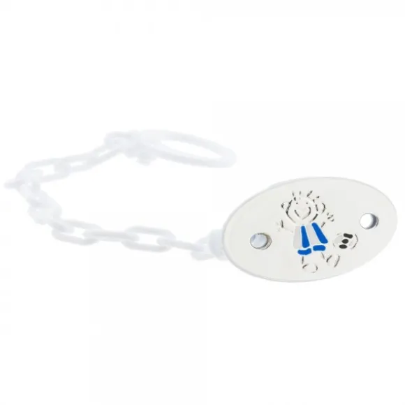 Chupetero ovalado de Plata de 1ª Ley (925mm) y PVC blanco con dibujo de niño jugando al fútbol con la camiseta blanquiazul en esmaltado azul y blanco. Medidas del chupetero: Alto 32mm y Ancho 47mm. Con posibilidad de grabar un Nombre o Fecha de Nacimiento. Segunda grabación no incluída en el precio.*Una vez realizada la grabación, no se admite devolución.