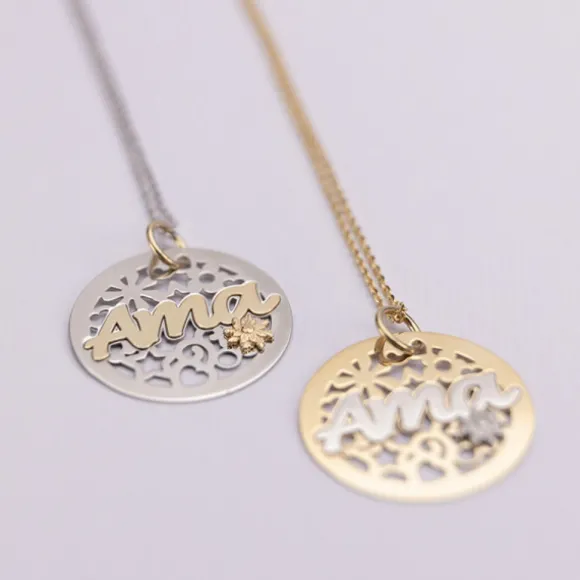 Colgante redondo calado de Plata de 1ª Ley (925mm) con grabación ama y mini motivo Eguzkilore bañados en Oro Amarillo de 18kt. Diámetro del colgante: 30mm. Medidas de la reasa: Alto 6mm y Ancho 1mm. Cadena no incluida.
