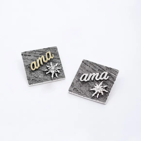 Colgante cuadrado de Plata de 1ª Ley (925mm) con textura. Contiene la palabra «ama» en una lámina de oro de 18kt. (750mm) junto a motivo Eguzkilore de plata. Medidas del colgante: 19mm de alto y 19mm de ancho. Medida de la reasa: 7mm. Cadena no incluida.