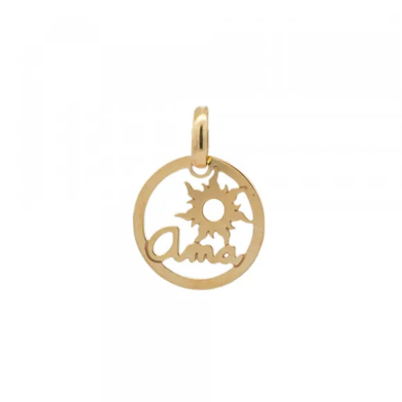 Colgante calado de Plata de 1ª Ley (925mm) bañado en oro 18kt. con letras Ama en el centro y motivo Eguzkilore en la parte superior de la pieza. Diámetro colgante: 15mm. Medida reasa: alto 7mm y ancho 5mm. Cadena no incluida.