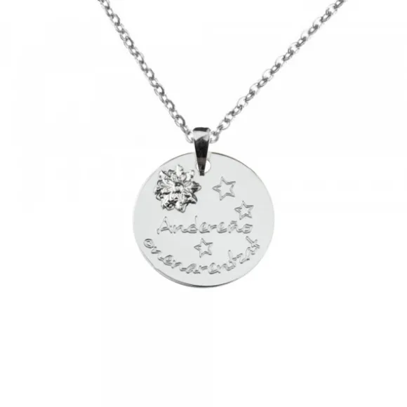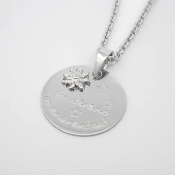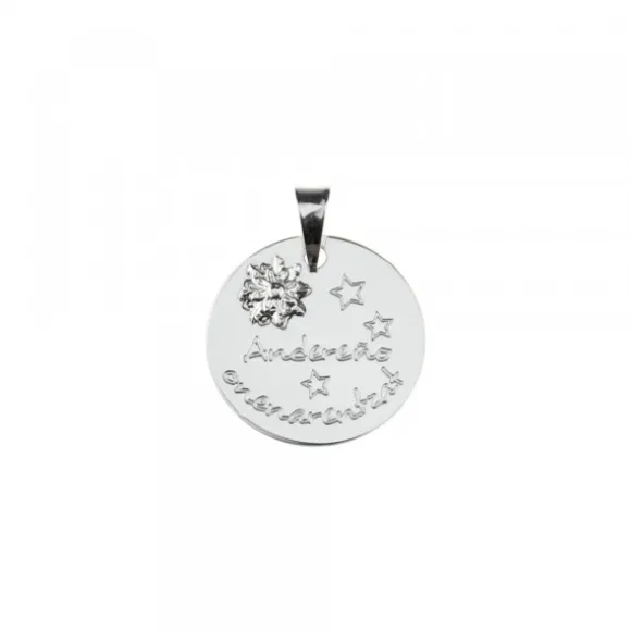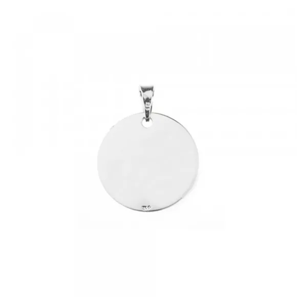 Colgante de Plata de 1ª Ley (925mm) circular con motivo «Andereño Onenarentzat» en surco en el interior del colgante con mini motivo Eguzkilore. Se puede grabar un nombre corto o fecha por la parte trasera. Diámetro de la pieza circular: 20mm. Cadena no incluida.*Una vez realizada la grabación, no se admite devolución.