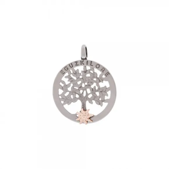 Colgante de Plata de 1ª Ley (925mm) cubierta por un baño de Rutenio. Se trata de un cerco de plata negra con forma circular con motivo del Árbol de La Vida en la parte central. Contiene motivo Eguzkilore de plata rosa en la parte inferior del cerco. Diámetro del colgante: 24mm. Medidas del Árbol de La Vida: alto 20mm y ancho 20mm. Medidas de la reasa: alto 5mm y ancho 1mm. Diámetro del Eguzkilore: 6mm. Grosor del cerco: 2mm. Cadena no incluida.