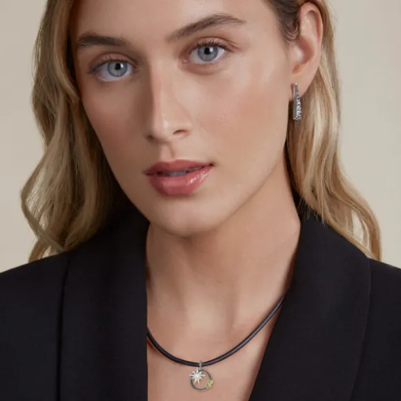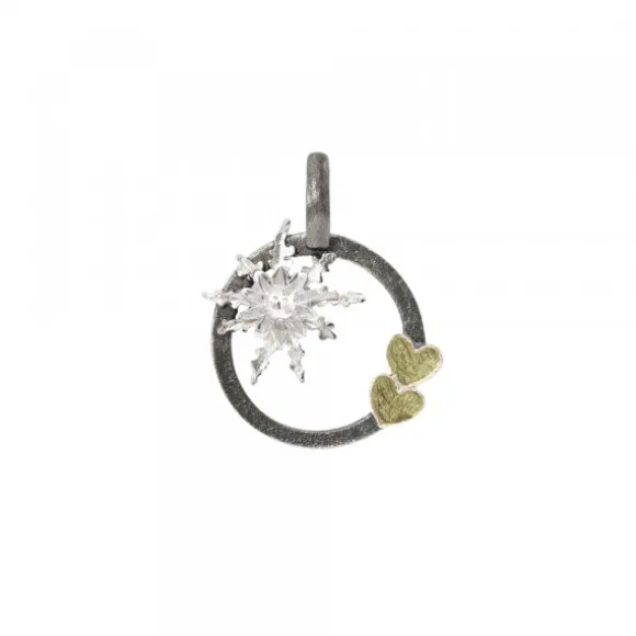 Colgante redondo calado en Plata de 1ª Ley (925mm) con textura que incluye un mini motivo Eguzkilore en plata y dos corazones con lámina de oro 18kt. Diámetro del colgante: 15mm. Diámetro de la reasa: 4mm. Cordón no incluido.