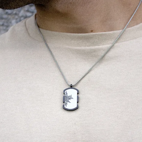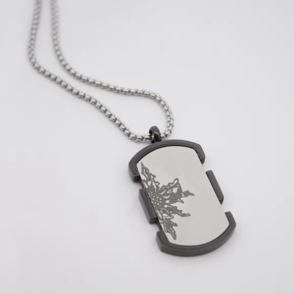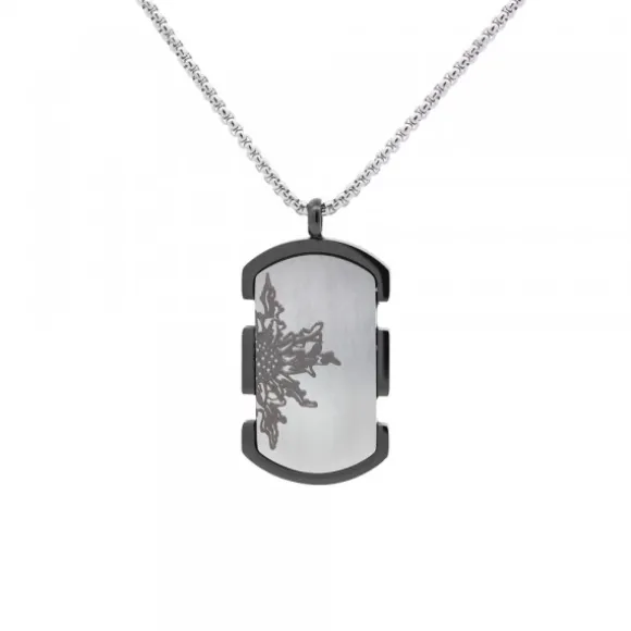Chapa rectangular de acero bicolor con esquinas ovaladas con medio Eguzkilore grabado en un lateral. Cadena bombata 1.5 de acero incluida. Medida chapa: alto 39mm y ancho 16mm. Medida cadena: 50cm (dos posiciones: a 45cm y 50cm).