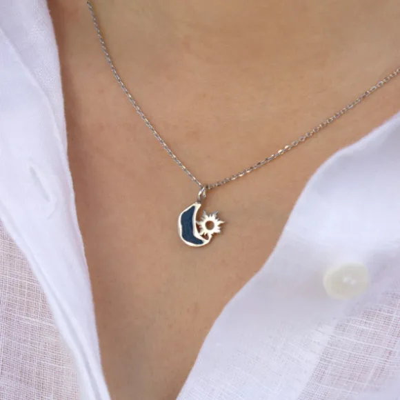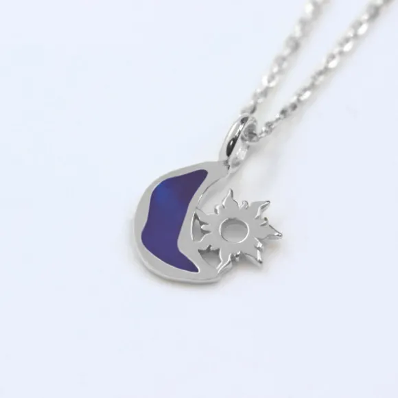 Colgante de la colección Mountain de Plata de 1ª Ley (925mm) con motivo Luna esmaltado en azul y Eguzkilore. Medida motivo: alto 13mm y ancho 13mm. Diámetro reasa: 6mm. Cadena no incluida.