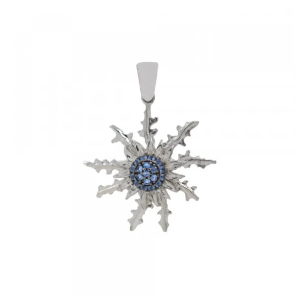 Colgante Eguzkilore de Plata de 1ª Ley (925mm) cubierto por 19 circonitas azules en la parte central. Diámetro del Eguzkilore: 29mm. Medidas de la reasa: alto 9mm y ancho: 4mm. Diámetro central de circonitas: 7mm. Diámetro de cada circonita: 1mm. Cadena no incluida.