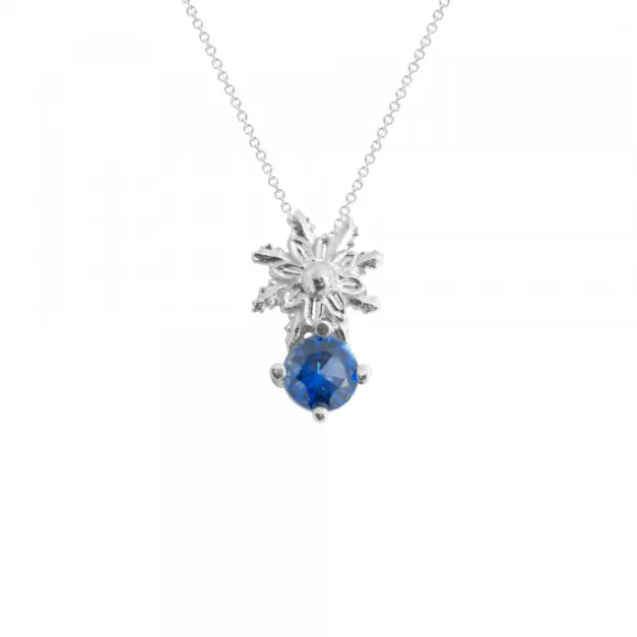Colgante en Oro Blanco reciclado (750mm – 18kt.) con Zafiro azul engarzado y motivo Eguzkilore en la parte de arriba de la colección Enea2 de Eguzkilore. Medidas del Zafiro: Ancho 4mm y Alto 4mm. Cadena no incluida.