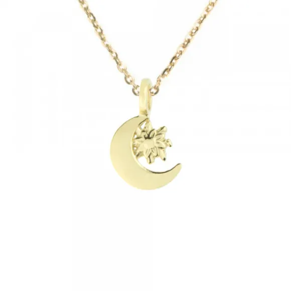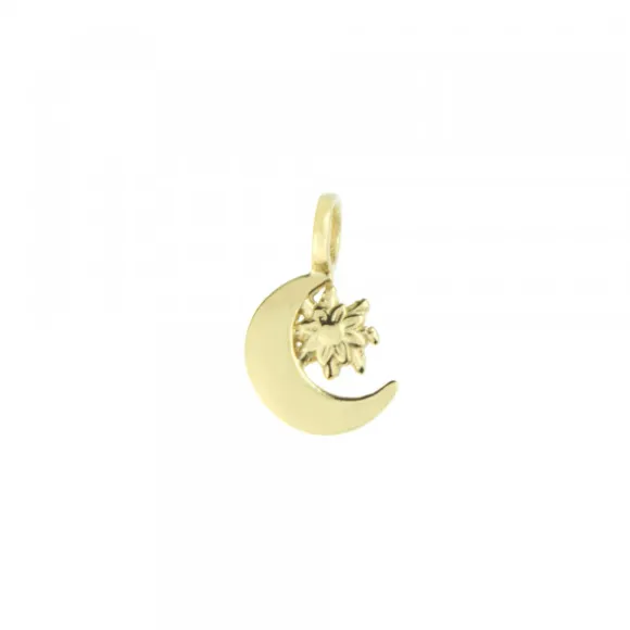 Colgante de Plata de 1ª Ley (925mm) bañado en Oro de 1ª Ley (750mm – 18kt.) con forma de media de luna y motivo eguzkilore en la parte superior. Medida del colgante: 11mm de alto y 11mm de ancho. Medida de la reasa: 5mm. Cadena no incluida.