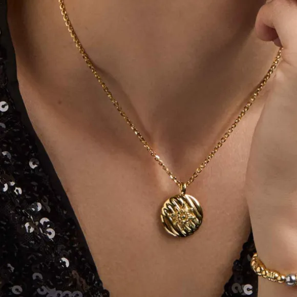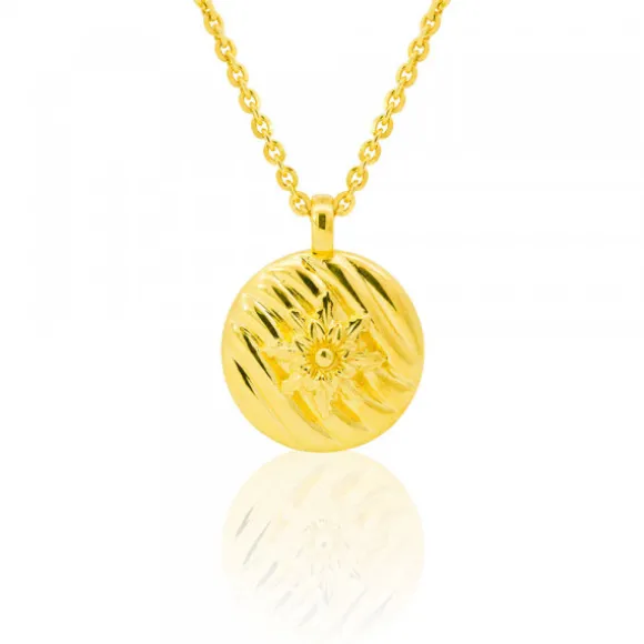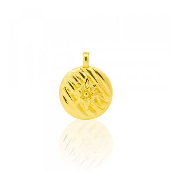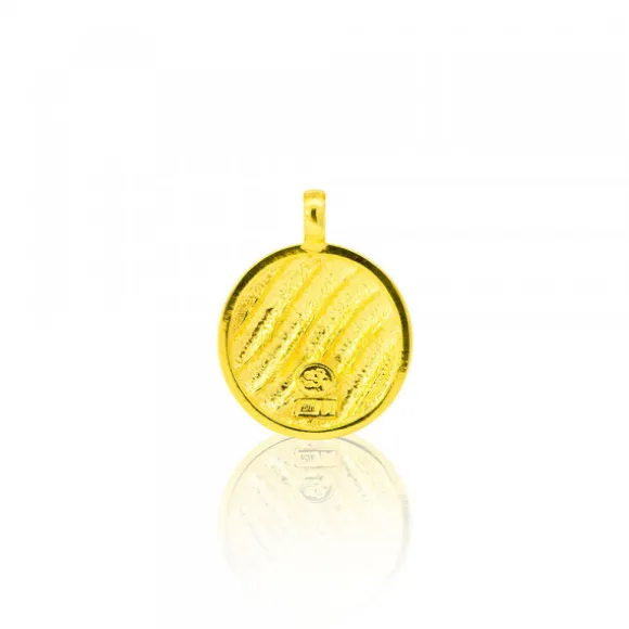 Colgante redondo de la colección Mask de Plata de 1ª Ley (925mm) bañado en oro 18kt. que evoca la belleza del mar con su diseño inspirado en una concha marina. Diámetro colgante: 20mm. Diámetro motivo Eguzkilore: 13mm. Cadena no incluida.
