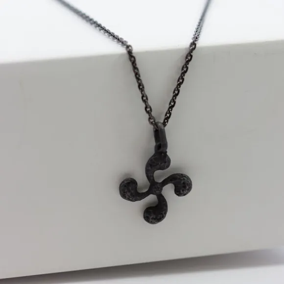 Colgante de Plata de 1ª Ley (925mm) oxidada en color negro con forma del clásico Lauburu. La pieza está elaborada artesanalmente y, mediante un meticuloso proceso, se ha obtenido un acabado texturizado. Es por eso, que cada pieza es única, no hay dos iguales. Diámetro Lauburu: 14mm. Medida reasa: alto 0.4mm y ancho 2mm. Grosor Lauburu: 2mm. Posibilidad de comprar junto a cable de acero triple hilo a juego, selecciona en el desplegable.