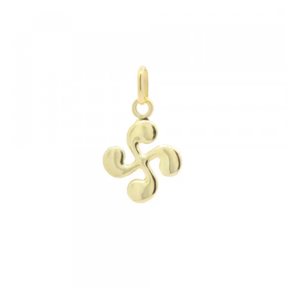 Colgante de Oro Amarillo reciclado (750mm – 18kt.) en forma de Lauburu. Símbolo vasco que significa trébol de cuatro brazos es una cruz de brazos curvilíneos. También los celtas y los visigodos lo usaban en sus tallas y representaciones artísticas. Diámetro del Lauburu: 10mm. Medidas de la reasa: alto: 5mm y ancho 1mm. Cadena no incluida.