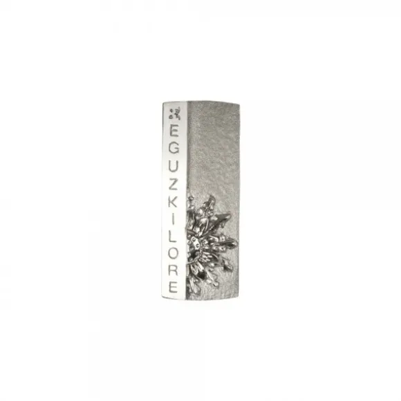 Colgante de Plata de 1ª Ley (925mm) cubierto por un baño de Rutenio. Se trata de una pieza de plata negra mate con forma rectangular curva con medio motivo Eguzkilore superpuesto en el lado derecho. En el lado izquierdo contiene otra pieza de plata mate superpuesta con logo y la palabra «Eguzkilore» en surco. Medidas del colgante: Alto 31mm y Ancho 13mm. Medidas de cada reasa: alto 10mm y ancho 1mm. Cordón no incluido.