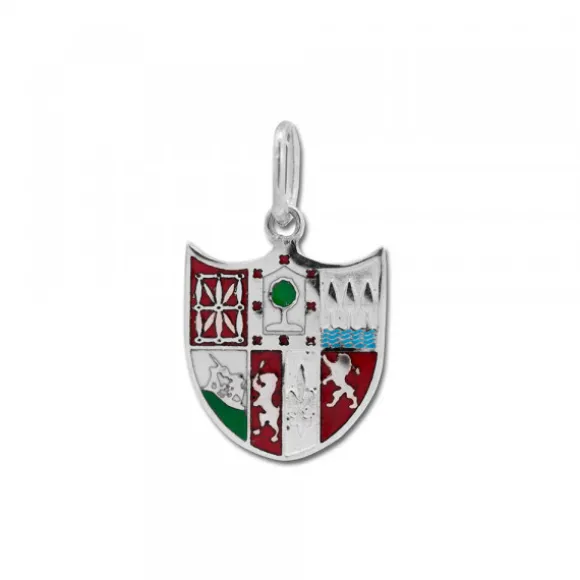 Colgante Zazpiak Bat de Plata de 1ª Ley (925mm) con esmalte de color y forma de escudo. Este colgante reune los escudos de las 7 provincias vascas representados con gran detalle cromática. El relieve de la plata realza cada símbolo heráldico, mientras que el esmalte aporta profundidad y viveza a la pieza. Opción personalizable con un nombre corto o fecha. Medida escudo: alto 17mm y ancho 16mm. Reasa: alto 6mm y ancho 3mm. Cadena no incluida.* Una vez realizada la grabación, no se admite devolución.