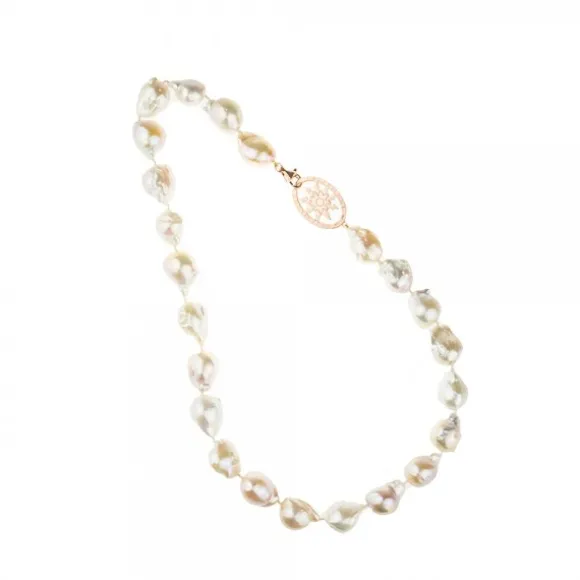 Collar de perlas cultivadas barrocas con motivo Eguzkilore de Plata de 1ª Ley (925mm) cubierta por un baño rosa de 18kt. El motivo está unido al cierre mosquetón. Medida del collar: 49cm.