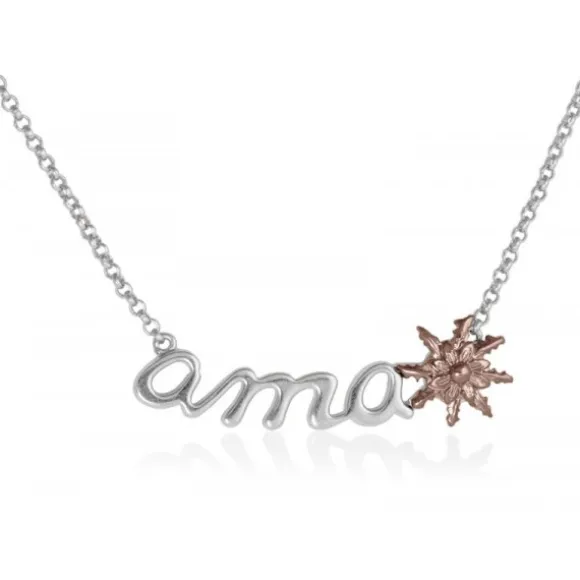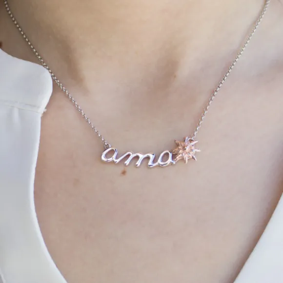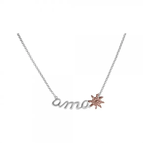 Gargantilla de Plata de 1ª Ley (925mm). Contiene un colgante con la palabra «Ama» junto a motivo Eguzkilore en plata rosa. La cadena es de tipo Rolo. Medida de la gargantilla: 45,5cm (Tres posiciones: 40,5cm, 43cm y 45,5cm). Medidas ama: Alto 6mm y Ancho 27mm. Diámetro del Eguzkilore: 11mm.