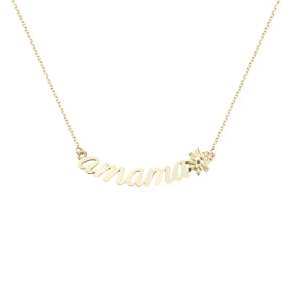 Gargantilla Amama en Oro Amarillo reciclado (750mm – 18kt.) compuesta por las letras Amama junto a motivo Eguzkilore a un lado. La cadena es tipo rolo y mide 45cm aproximadamente.