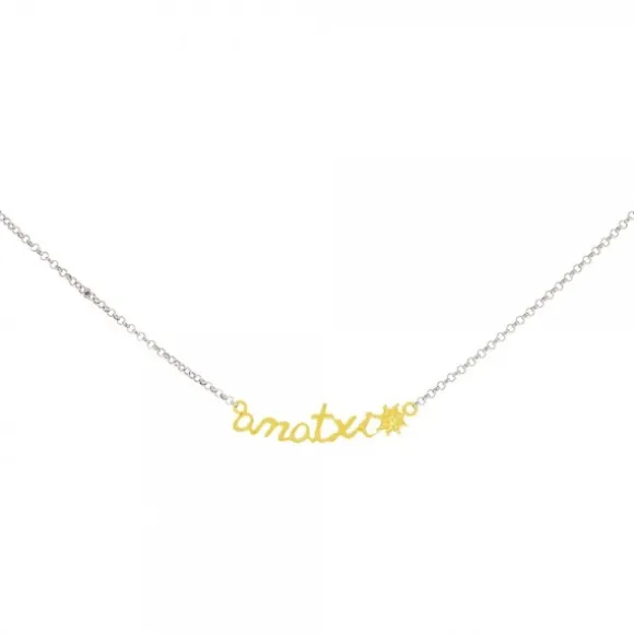 Gargantilla de Plata de 1ª Ley (925mm). Contiene la palabra «amatxi» junto a motivo Eguzkilore,nuestro símbolo de protección,de plata dorada. La cadena es de tipo Rolo. Forma amorosa de decir ama muy típico de Navarra. Medida de la gargantilla: 46cm (Tres posiciones: 41cm, 43,5cm y 46cm). Medidas amatxi: Alto 7mm y Ancho 26mm. Diámetro del Eguzkilore: 6mm.