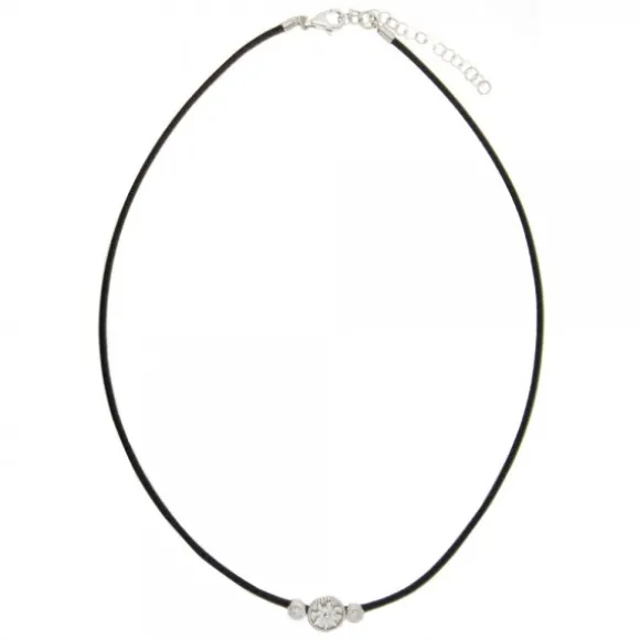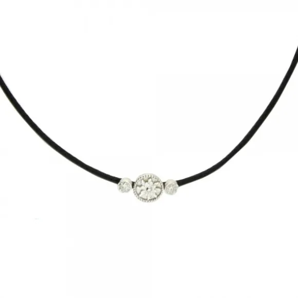 Gargantilla de cuero negro y 3 piezas redondas con cerco perlado y motivo Eguzkilore y terminales de Plata de 1ª Ley (925mm). Medida de la gargantilla: 40+5cm. Medida ajustable.