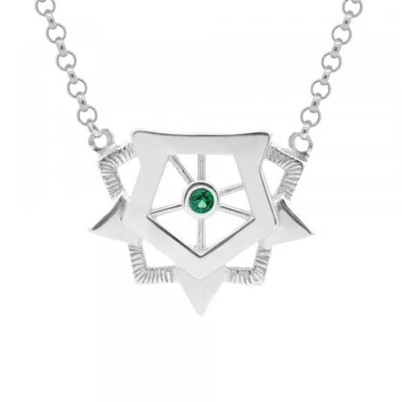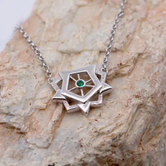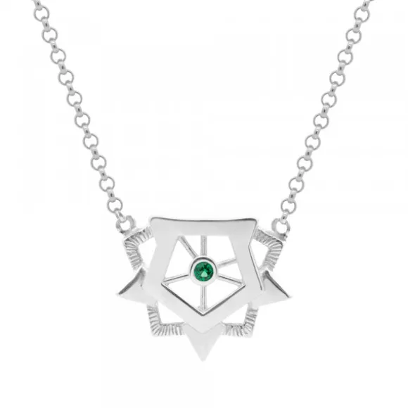 Gargantilla de Plata de 1ª Ley (925mm) con acabado brillo y circonita verde en el centro de la pieza. Esta joya es un homenaje a la Ciudadela, la fortificación renacentista ubicada en Pamplona-Iruña. Cadena tipo rolo. Largura gargantilla: 41cm + alargador de 5cm con tres posiciones. Medida pieza central: alto 15mm y ancho 18mm. Diámetro circonita: 2mm.
