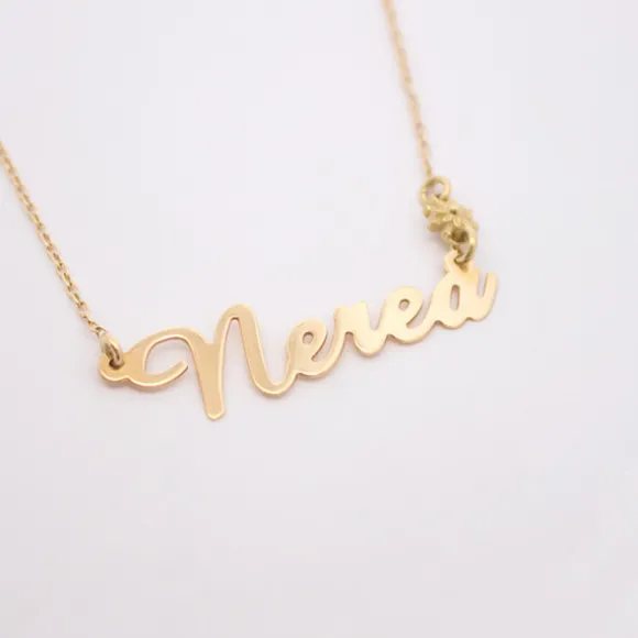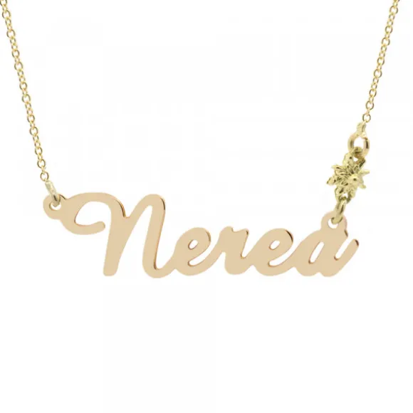 Gargantilla de Oro reciclado (750mm-18kt.) personalizada con el nombre «Nerea» y motivo Eguzkilore en el lateral derecho. Largura de la cadena: 43cm aproximadamente. Cierre reasa. Diametro del motivo eguzkilore:. 4mm. Dimensiones del nombre: 30mm de ancho y 8mm de alto.
