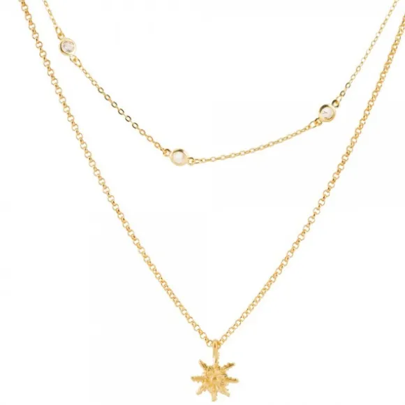 Gargantilla doble de Plata de 1ª Ley (925mm) cubierta por un baño de oro amarillo de 18kt. Se trata de dos cadenas de diferentes larguras unidas entre sí. La cadena larga contiene un motivo Eguzkilore y la cadena corta contiene 11 circonitas blancas a lo largo de ella. Medida de la gargantilla: 45cm + 3,5cm de alargador. Diámetro de cada pieza circular: 3mm. Diámetro de cada circonita: 2mm.