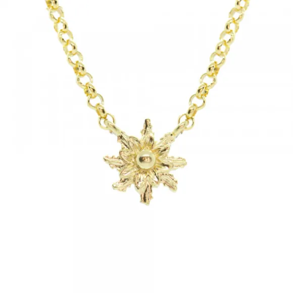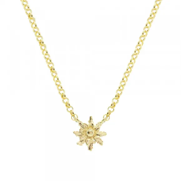 Gargantilla de Plata de 1ª Ley (925mm) bañada en oro amarillo de 18kt. con mini motivo en forma de Eguzkilore. La cadena es tipo Rolo. Medida de la cadena: 41cm (Tres posiciones 37cm, 39cm y 41cm). Diámetro del Eguzkilore: 8mm.