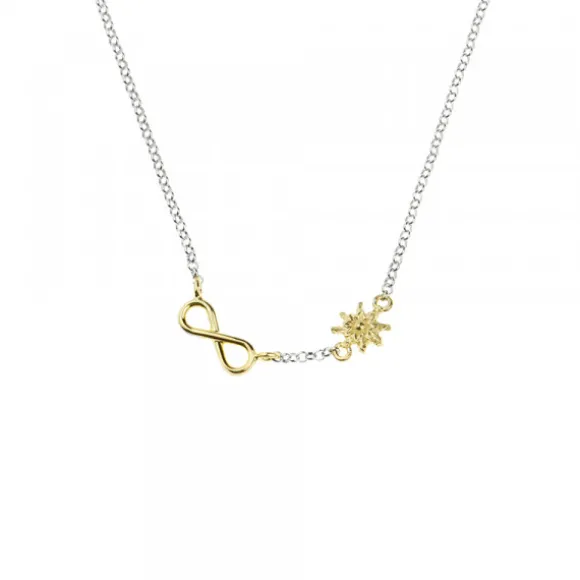 Gargantilla Infinito de Plata de 1ª Ley (925mm) con Infinito y motivo Eguzkilore de plata dorada. La cadena es de tipo Rolo. Medida de la gargantilla: 45cm (Tres posiciones: 40,5cm, 43cm y 45cm). Diámetro del Eguzkilore: 7mm. Medidas del infinito: Alto 4mm y Ancho 12mm.*En caso de querer la gargantilla de plata es necesario pedir por encargo y se entregará en un plazo de 2-3 semanas.