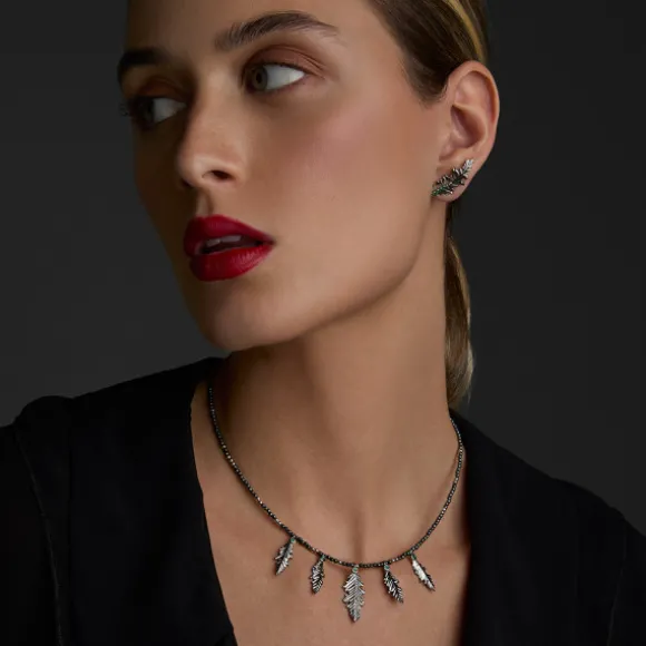 Gargantilla de Plata de 1ª Ley (925mm) con baño de Rutenio de la colección Mari. La gargantilla está compuesta por collar de hematites en tonalidades plata y rutenio y motivos con forma de hoja de la flor Eguzkilore en rutenio. En la parte central de cada hoja se encuentra una circonita verde. Cierre langosta. Largura gargantilla: 40cm (+ 3cm de alargador). Medida hoja grande: alto 26mm y ancho 11mm. Medida hoja pequeña: alto 20mm y ancho 7mm. Medida hematite: 2mm.