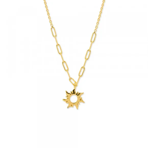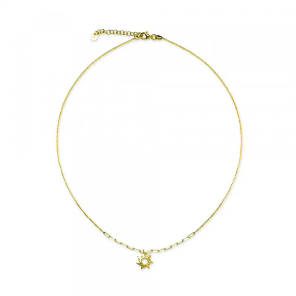 Gargantilla Mountain de Plata de 1ª Ley (925mm) bañada en oro amarillo 18kt. con motivo Eguzkilore en el centro compuesta por cadena tipo forza y eslabones alargados. Cierre langosta. Largura gargantilla: 42cm + 3,5cm de alargador. Medida Eguzkilore: 11mm. Medida eslabón alargado: alto 6mm y ancho 1,5mm.