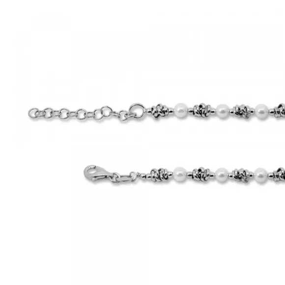 Gargantilla de Plata de 1ª Ley (925mm) besos y abrazos con perlas cultivadas, piezas circulares y piezas mallina intercaladas. Cierre langosta. Largura gargantilla: 37,5cm + 3cm de alargador. Diámetro perla: 4mm.