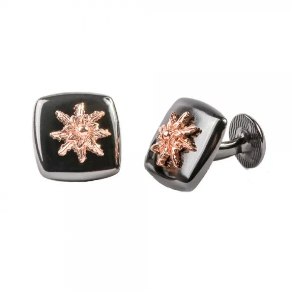 Gemelos de Plata de 1ª Ley (925mm) cubiertos por un baño de Rutenio. Contiene una pieza de plata negra con forma cuadrada y motivo Eguzkilore de plata cubierta por un baño de Oro Rosa de 18kt. en la parte central. Diámetro del gemelos: 17mm.