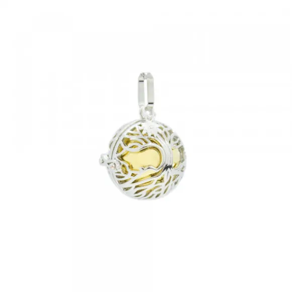 Llamador de Ángeles de Latón cubierto por un baño de rodio con colgante musical de forma del Árbol de La Vida calado y una pieza musical en color dorado en su interior. Contiene motivo Eguzkilore de Plata de 1ª Ley (925mm). La cadena es larga de acero inoxidable tipo Forza con bolas intercaladas a lo largo de ella. Únicamente el Eguzkilore es de Plata de 1ª Ley. Medida de la cadena: 110cm. Diámetro del Árbol de La Vida: 24mm. Diámetro del Eguzkilore: 6mm. Diámetro de la pieza redonda con sonido: 20mm. Diámetro de cada bola de la cadena: 3mm.