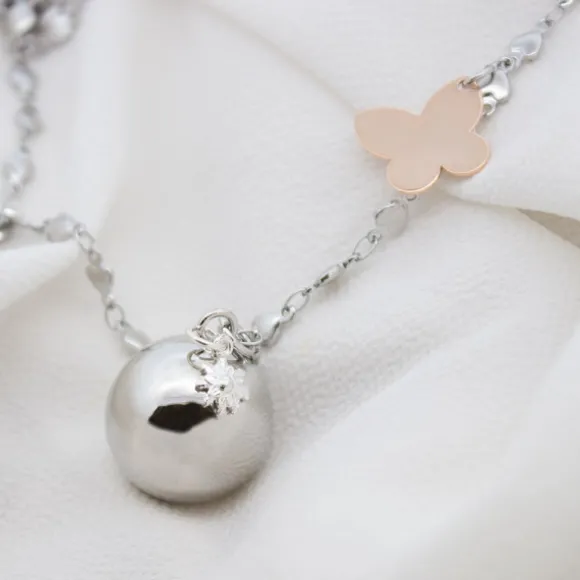 Llamador de Ángeles de latón y bronce cubierto por un baño de rodio con bola musical y motivo Eguzkilore de Plata de 1ª Ley (925mm). La cadena es larga de acero inoxidable tipo Forza con forma de corazones intercaladas a lo largo de ella y pieza con forma de Mariposa en Plata de Ley bañado en oro rosa de 18kt. que puede grabar un nombre o fecha de nacimiento. Únicamente el Eguzkilore es de Plata de 1ª Ley (925mm). Medida de la cadena: 110cm. Diámetro de la Pieza Musical: 20mm. Diámetro del Eguzkilore: 6mm. Medidas de la Mariposa: Alto 14mm y Ancho 15mm. Diámetro de cada Corazón: 4mm.*Una vez realizada la grabación, no se admite devolución.