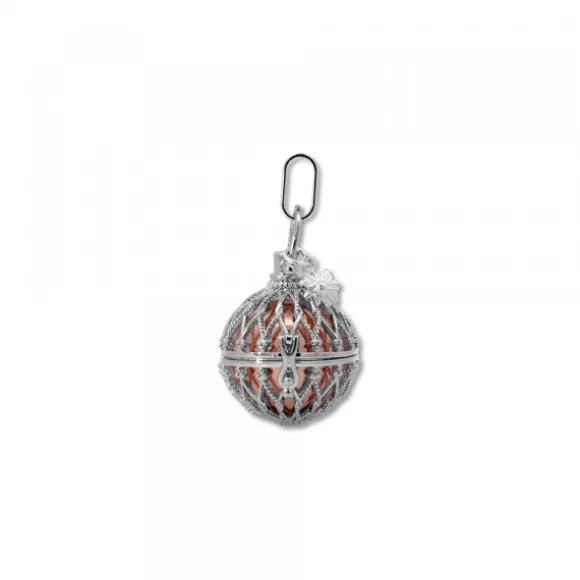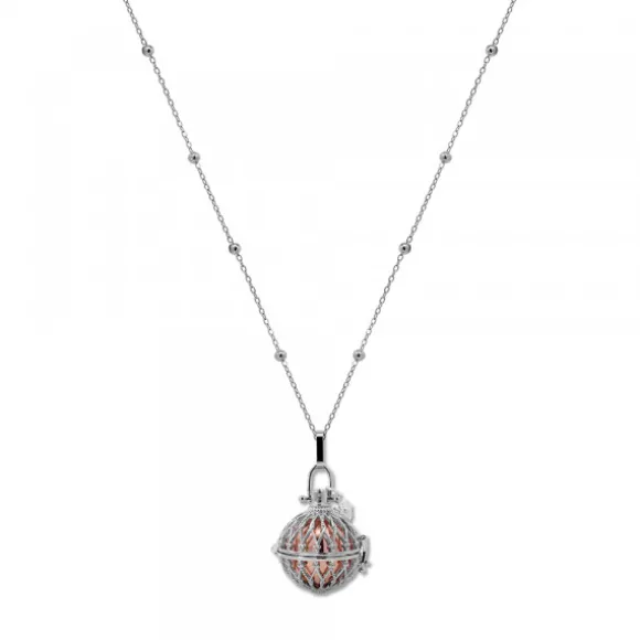 Llamador de Ángeles de Latón cubierto por un baño de rodio con colgante compuesto por rombos entrelazados y una pieza musical color rosa en su interior. Contiene motivo Eguzkilore de Plata de 1ª Ley (925mm). La cadena es larga de acero inoxidable tipo Forza con bolas intercaladas a lo largo de ella y mariposa dorada con posibilidad de personalizar con una inicial o número. Medida de la cadena: 110cm Diámetro llamador: 20mm. Diámetro del Eguzkilore: 6mm. Diámetro de la pieza redonda con sonido: 13mm. Diámetro de cada bola de la cadena: 3mm. Diámetro mariposa: alto 11mm. Únicamente el Eguzkilore es de Plata de 1ª Ley.* Una vez realizada la grabación, no se admite devolución.