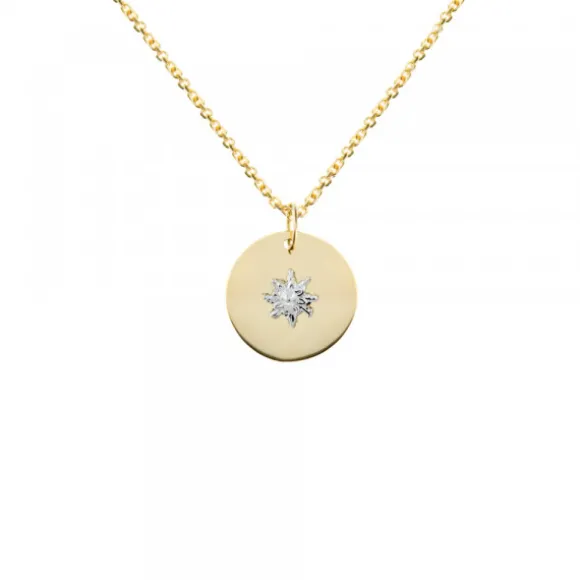 Medalla redonda de Oro Amarillo reciclado (750mm-18kt.) con motivo Eguzkilore en la parte de abajo de Oro Blanco de 18kt. Posibilidad de grabar un nombre corto o fecha en la parte trasera. Diámetro de la medalla: 12mm. Medidas de la reasa: alto 5mm y ancho 1mm. Una vez realizada la grabación, no se admite devolución.* Cadena no incluida.