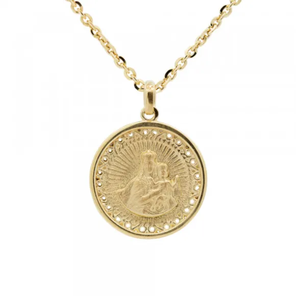 Medalla Virgen del Carmen de Plata de 1ª Ley (925mm) bañado en oro amarillo de 18kt. con forma redonda. Posibilidad de grabar un nombre corto o fecha en la parte de atrás. Diámetro Medalla: 20mm. Medida reasa: 5mm alto y 4mm ancho. Cadena no incluida.* Una vez realizada grabación, no se admite devolución.