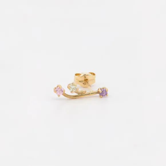 Pendiente mini trepador de Oro reciclado (750mm-18kt.) en forma de flor con 3 circonitas de color lilas y verdes engarzadas en forma redonda. Cierre de presión.*Edición Limitada disponible sólo en web.