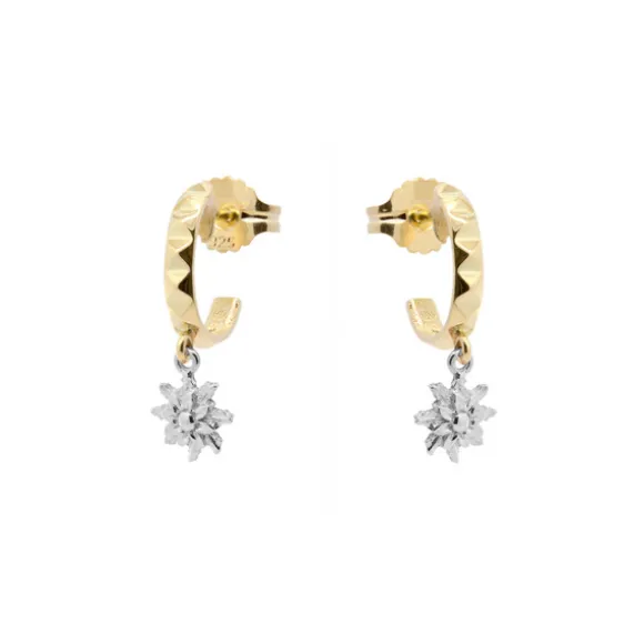 Pendientes Aiora con forma de medio aro de Plata de 1ª Ley (925mm) bañados en Oro 18kt. (750mm) reciclado, simulando tachuelas piramidales cuadradas y Eguzkilore plata colgante. Cierre presión. Medida Pendiente: 24mm y ancho 2.5mm. Medida Aro: alto 13mm y ancho 2.5mm. Diámetro Eguzkilore: 7mm.
