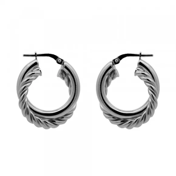 Pendientes de Aro de Plata de 1ª Ley (925mm) formado por dos aros entrelazados, uno liso y el otro efecto enroscado bañados en rutenio. Cierre criolla. Diámetro del aro: 20mm.