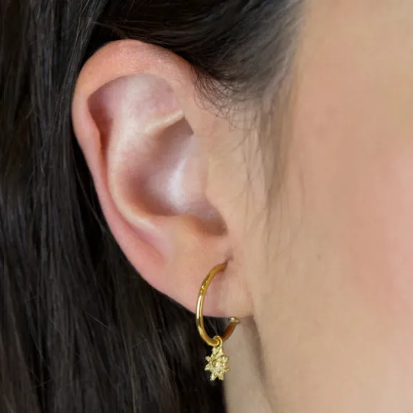 Pendientes de aro de Plata de 1ª Ley (925mm) bañados en Oro Amarillo de 18kt. Contienen pieza con motivo Eguzkilore colgando del aro. Cierre de presión. Diámetro del aro: 15mm. Diámetro del Eguzkilore: 6mm.