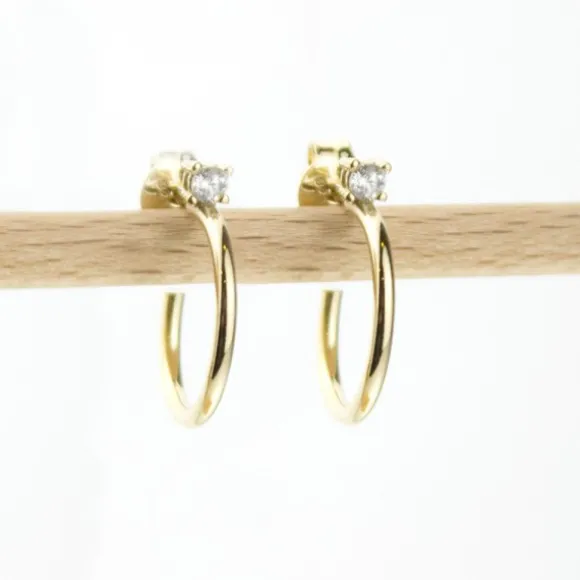Pendientes de Aro Plata de 1ª Ley (925mm) bañados en Oro Amarillo de 18kt. con circonita blanca engarzada con cuatro patas en la parte superior del aro. Cierre presión. Diámetro del aro: 15mm.