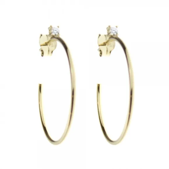 Pendientes de Aro Plata de 1ª Ley (925mm) bañados en Oro Amarillo de 18kt. con circonita blanca engarzada con cuatro patas en la parte superior del aro. Cierre presión. Diámetro del aro: 30mm.