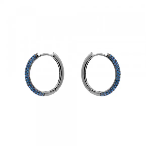 Pendientes de Aro de Plata de 1ª Ley (925mm) bañado en rutenio con circonitas azules en la parte frontal. Cierre criolla. Diámetro del aro: 17mm.