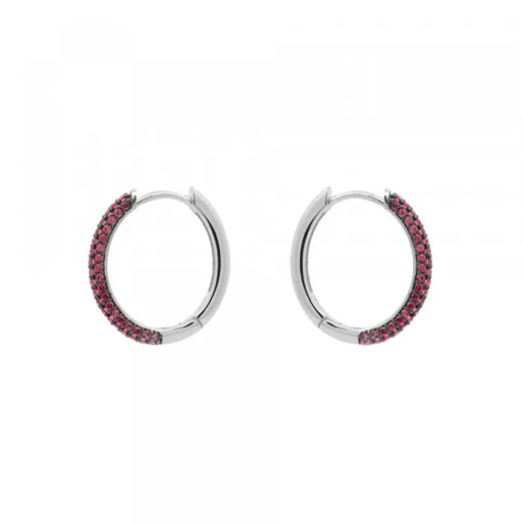 Pendientes de Aro de Plata de 1ª Ley (925mm) con circonitas rosas en la parte frontal. Cierre criolla. Diámetro del aro: 17mm.