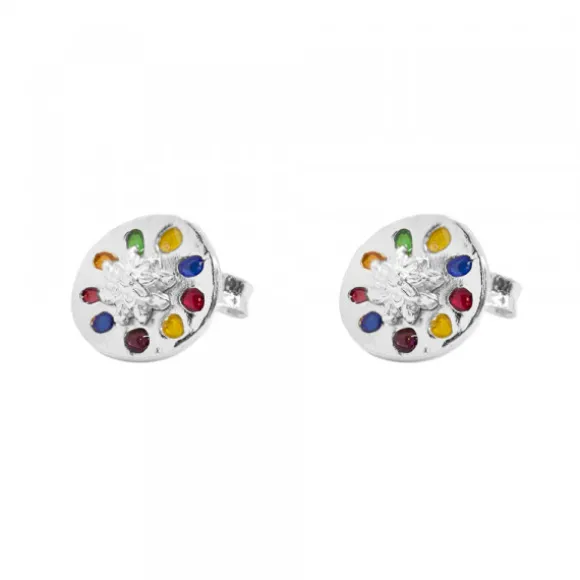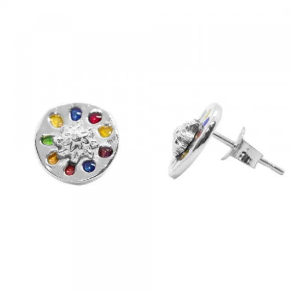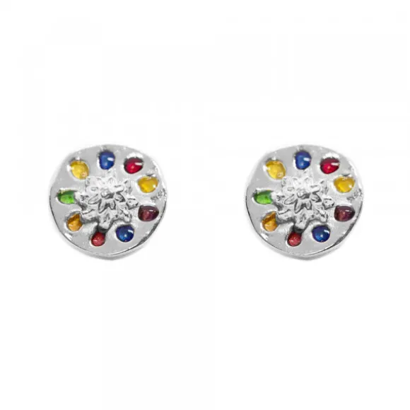 Pendientes de Plata de 1ª Ley (925mm) con motivo Eguzkilore en el centro rodeado de 9 gotas con esmalte multicolor. Cierre de presión. Diámetro de los pendientes: 11mm. Diámetro del Eguzkilore: 6mm.